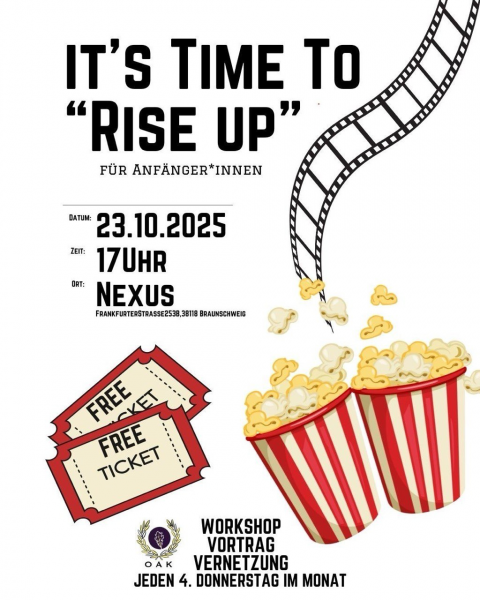 Zu sehen ist ein Plakat. Oben steht in schwarze Schrift It‘s Time to „rise up“ – Für Anfänger*innen darunter die Daten der Veranstaltung. Rechts daneben ist ein geschwungenes  Filmband einer Filmrolle zu sehen. Darunter zwei rot weiß gestreifte Becher mit Popcorn. Links daneben zwei Kinokarten auf denen steht Free Ticket, sie haben einen roten Rand. Unten mittig sieht man das Logo der Veranstalter*innen. Einen Kranz nach oben geöffnet. In einem lila Kreis ist ein Eichenblatt zu sehen. Unter dem Blatt steht OAK. Neben dem Logo steht untereinander Workshop – Vortrag – Vernetzung – Jeden 4. Donnerstag im Monat.