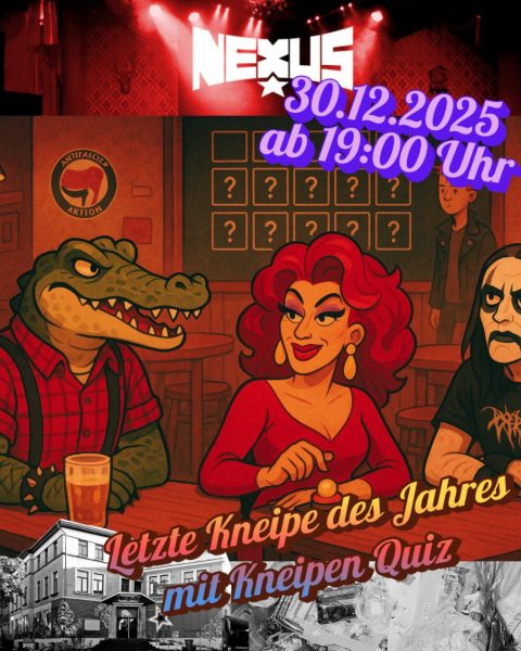Zum Ende des Jahres ’25 kommen wir alle nochmal zusammen. In Gedenken an Dirk, in Solidarität mit vielen, in Freude auf das Kommende.Und ihr seid alle herzlich eingeladen! Alle Punks und Queers, alle Loner und Grinches, alle Dragqueens und -Kings, Metallerinnen und Krokodile; Falken, Feminist_innen und Nachtkatzen. Egal wie oft ihr im Haus seid. Am Todestag unseres Freundes Dirk werden wir das gute Leben feiern. Ab 19:00 Uhr sind die Türen geöffnet, den Abend über kann getrunken, gefeiert und solidarisch gebastelt werden für Projekte, die dieses Jahr Ziel von rechten Angriffen waren. Ab 20:30 Uhr startet dann das große Nexus-Kneipenquiz mit unglaublichen Gewinnmöglichkeiten für alle.Kommt vorbei, lasst euch ein.