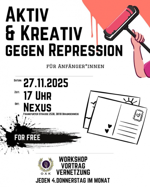 Alternativtext: Zu sehen ist ein Plakat. Oben steht in schwarze Schrift Aktiv und Kreativ gegen Repression – Für Anfänger*innen. Darunter stehen die Daten der Veranstaltung 27.11. um 17 Uhr im Nexus. Oben rechts sieht man einen gezeichneten Arm mit einer großen Farbrolle. Die oberer rechte Ecke wird rot gestrichen. Rechts neben den Daten sind zwei gezeichnete Postkarten zu sehen.