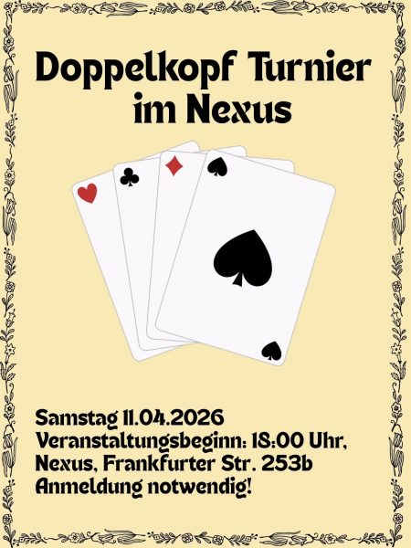 Alternativtext: Ein Plakat mit beigem Hintergrund. In der Mitte steht in großer schwarzer Schrift: „Doppelkopf Turnier im Nexus“. Darunter sind vier Spielkarten mit den Symbolen Herz, Kreuz, Karo und Pik abgebildet. Unten folgt der Veranstaltungstext: „Samstag 11.04.2026, Veranstaltungsbeginn: 18.00 Uhr, Anmeldung notwendig!“.